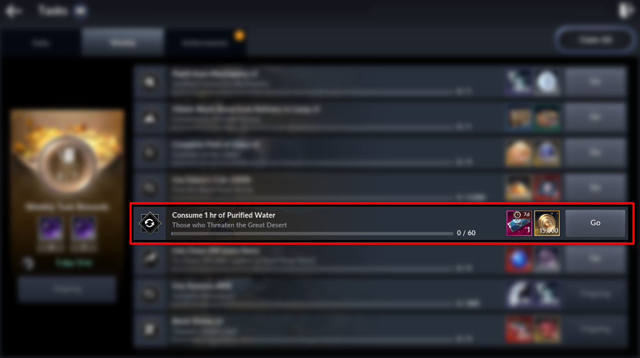 - Obtain Cursed Pirate Island Pass x1 each upon completing the Weekly Task "Consume 1 hr of Purified Water" or "Defeat Enemy in the Darkness x50,000" (Max 2 per week).
