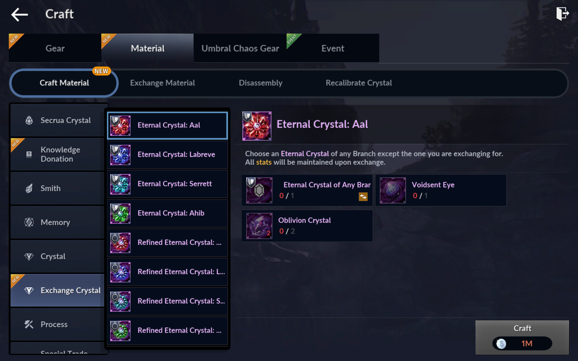 | Eternal Crystal, Refined Eternal Crystal | ㆍEternal Crystal / Refined Eternal Crystal of any branch x1 ㆍVoidsent Eye x1 ㆍOblivion Crystal x2 ㆍ1,000,000 Silver |